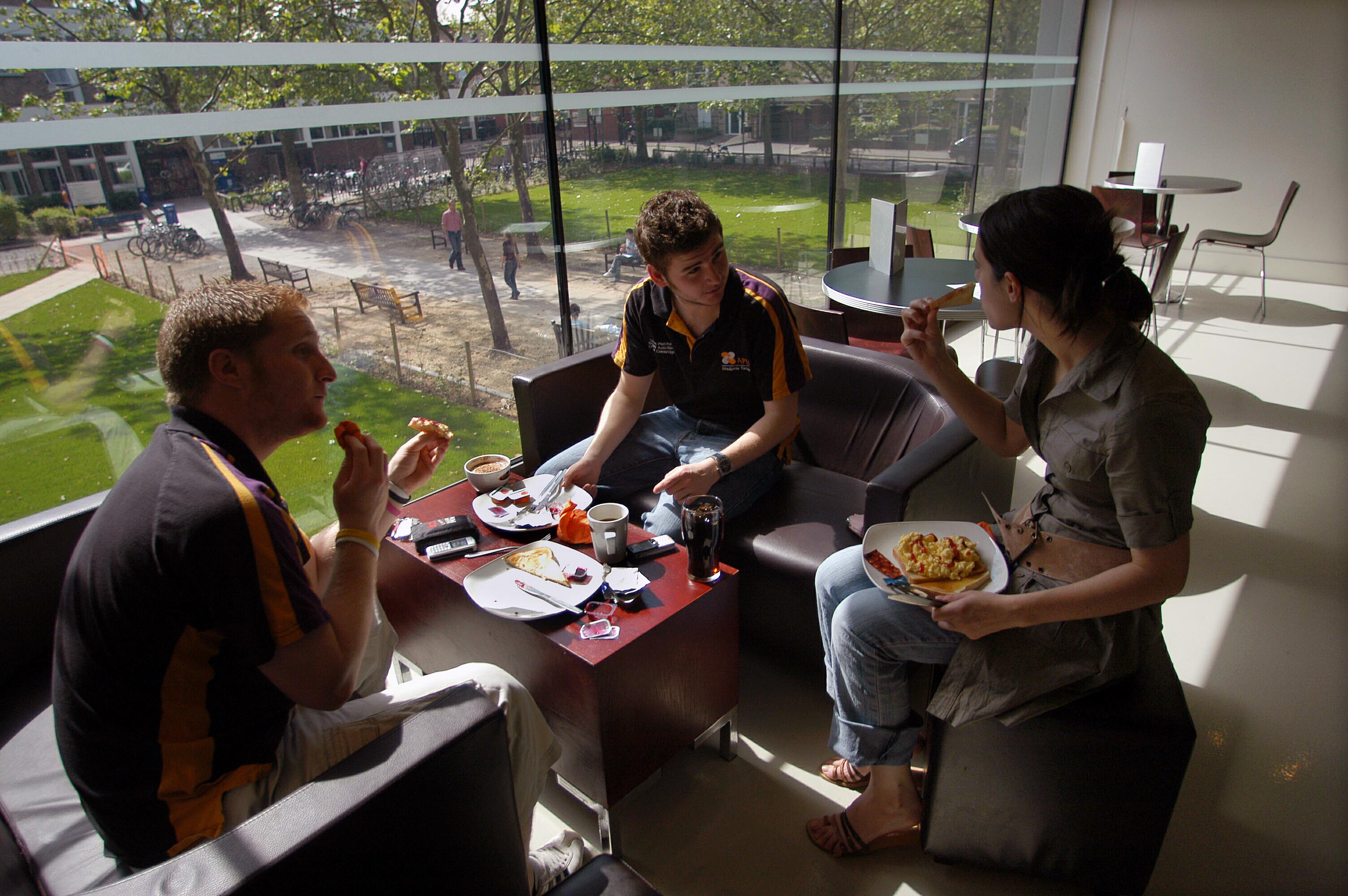 Pic by Si Barber - 07739 472 922 Students (L-R) Andi Thwaites, Ciaran Pietzka, and Kim Tebbutt in the refectory area of the Anglia Polytechnic University, Cambridge. 270505. Ordered by Ranjit