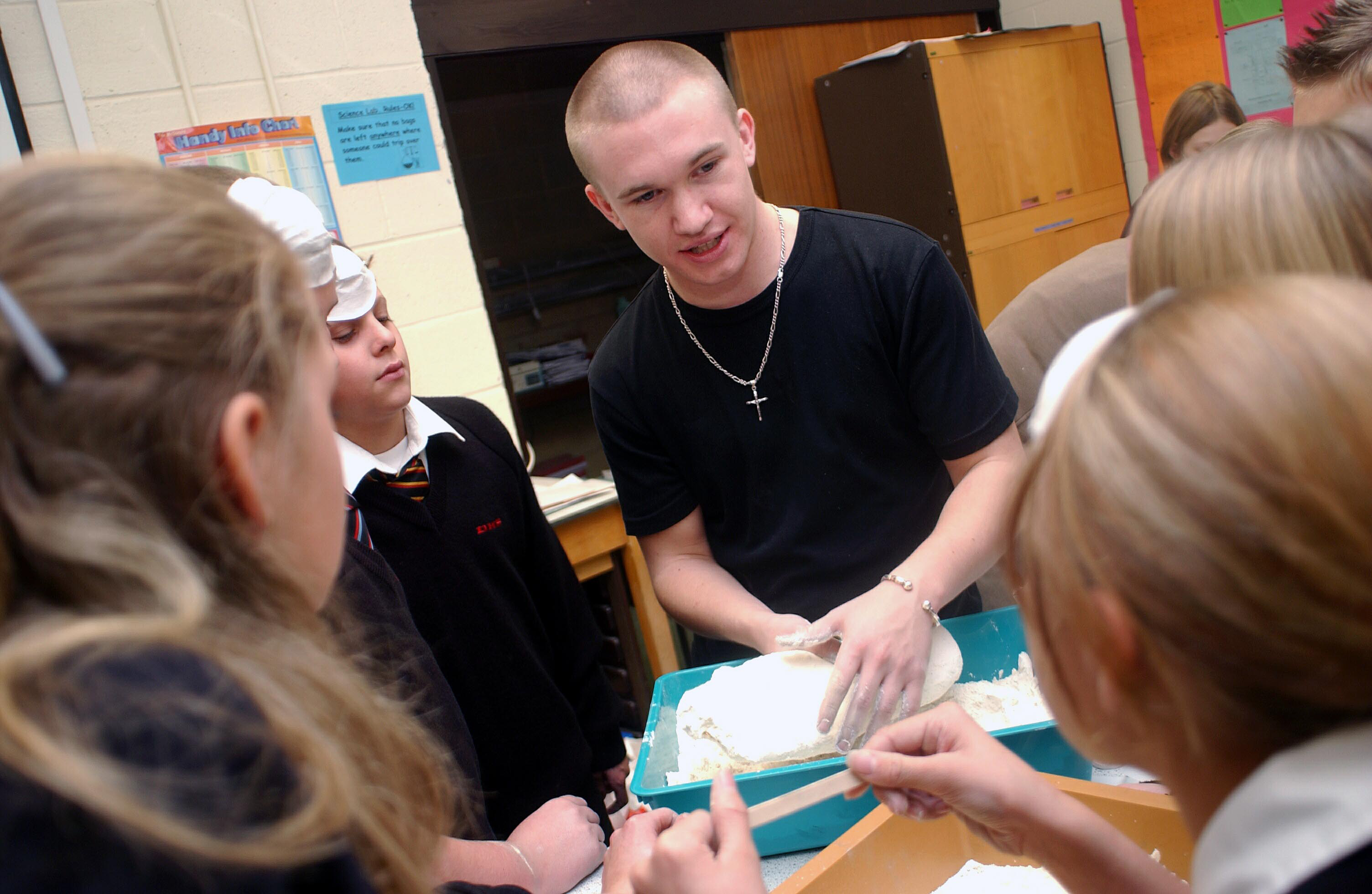 Pic by Si Barber - 07739 472 922 Pupils of Debenham High School, Suffolk, listening to a lecture by Forensic Investigator Joe Martin of Crime Scene Science on how to make a footprint cast 22.11.05