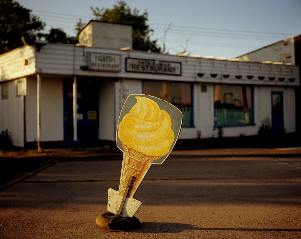 A closed restaurant with a sign for ice cream in the foreground, Sculthorpe, Norfolk, UK.