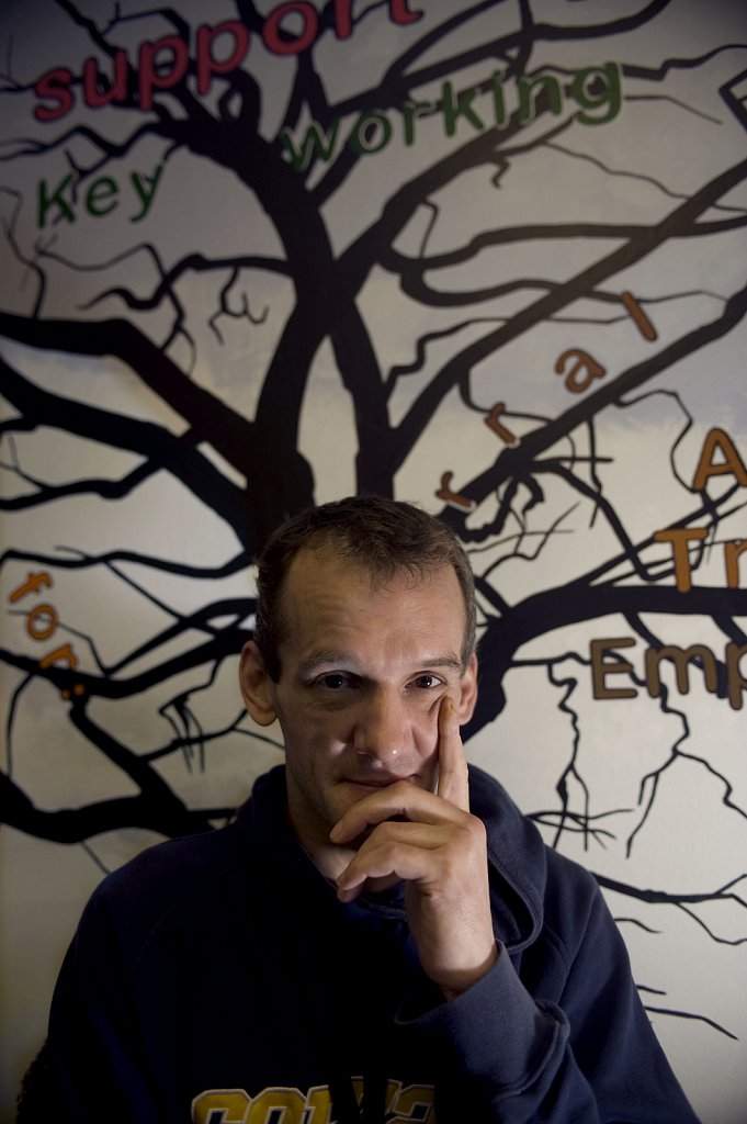 Shaun Svilts with his mural at the National Treatment Agency in Peterborough, Cambs.