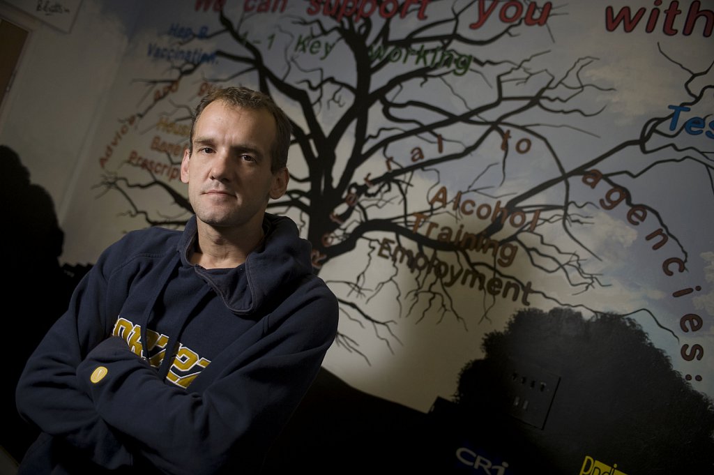 Shaun Svilts with his mural at the National Treatment Agency in Peterborough, Cambs.