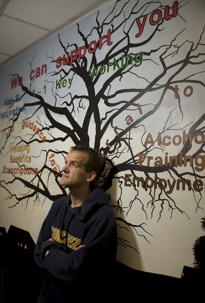 Shaun Svilts with his mural at the National Treatment Agency in Peterborough, Cambs.