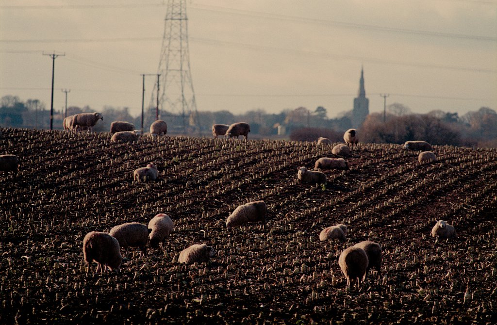 Sheep grazing on harvested crops, Lincolnshire, UK
