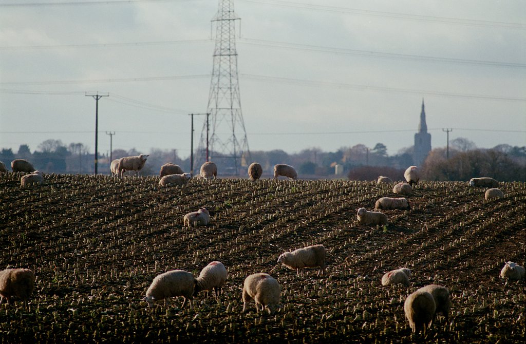 Sheep grazing on harvested crops, Lincolnshire, UK