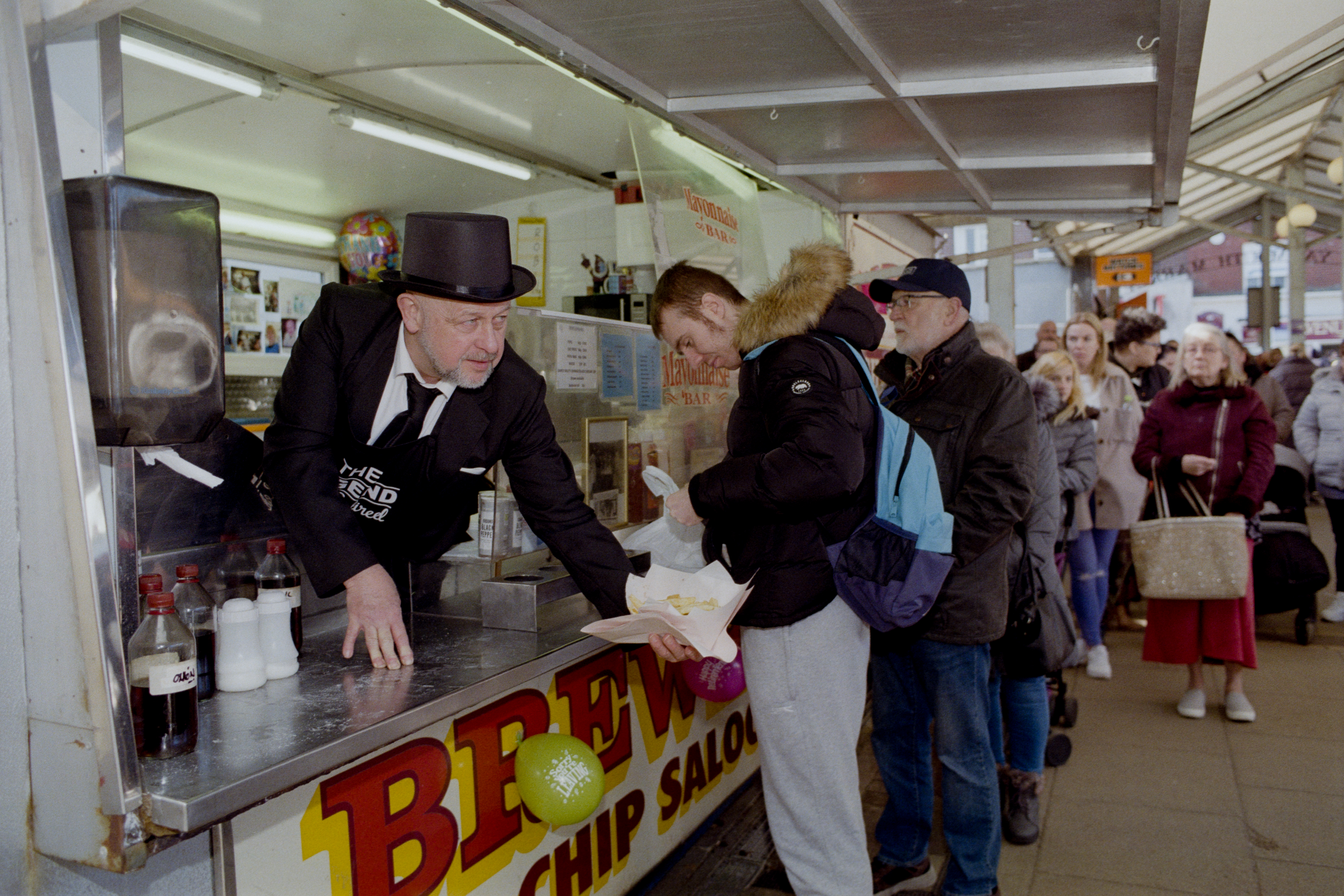 Mr Robin Platten of Brewer's Chip Saloon serving customers in funeral apparel on their last day of trading on the old market. Brewer's had been trading in the same spot since 1902.
