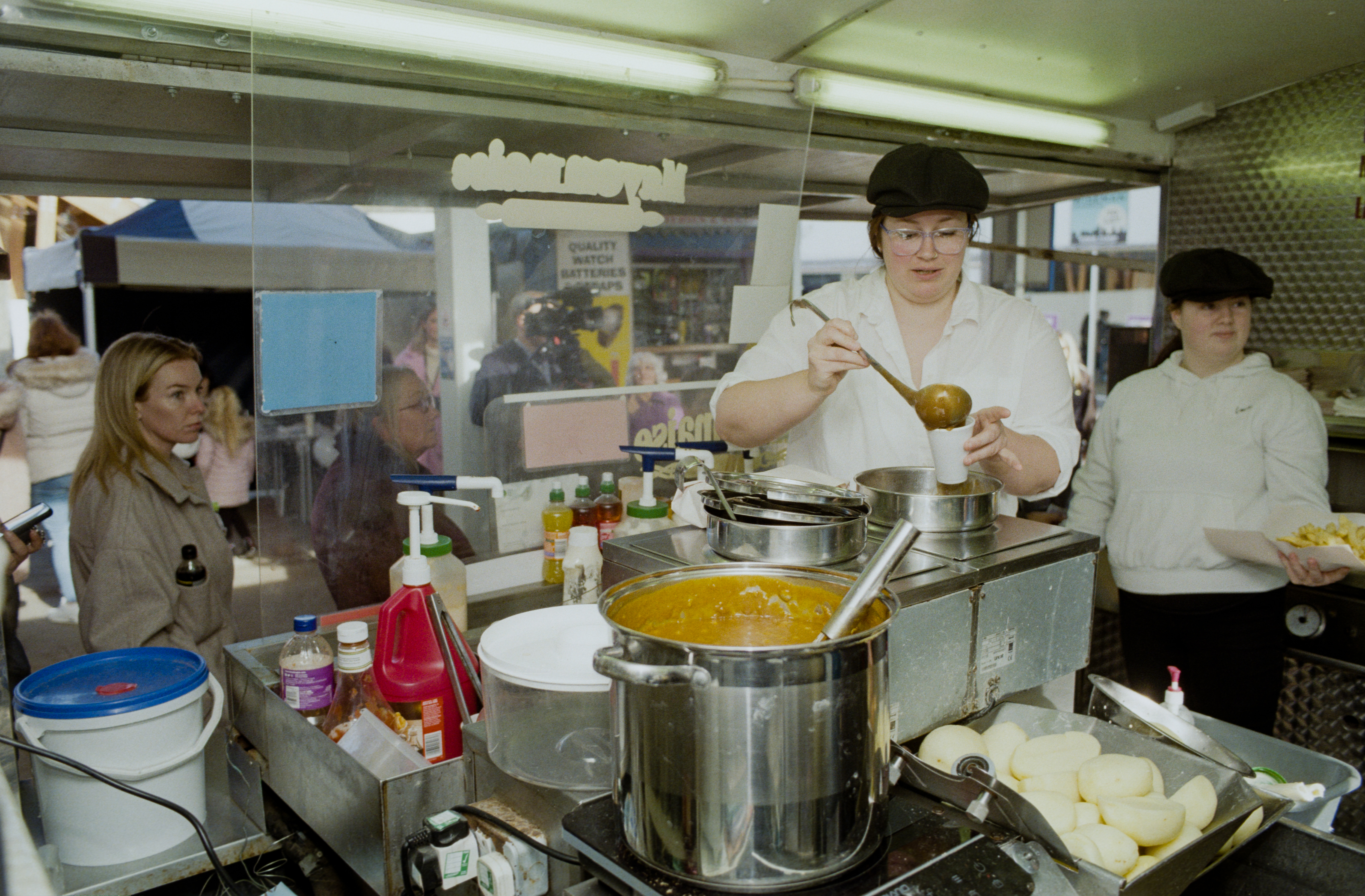 Robin Platten of Brewer's Chip Saloon serving customers on their last day of trading at Great Yarmouth market, Norfolk,UK. Brewer's has been trading since 1902 and will close when the market moves to a new area in the town.