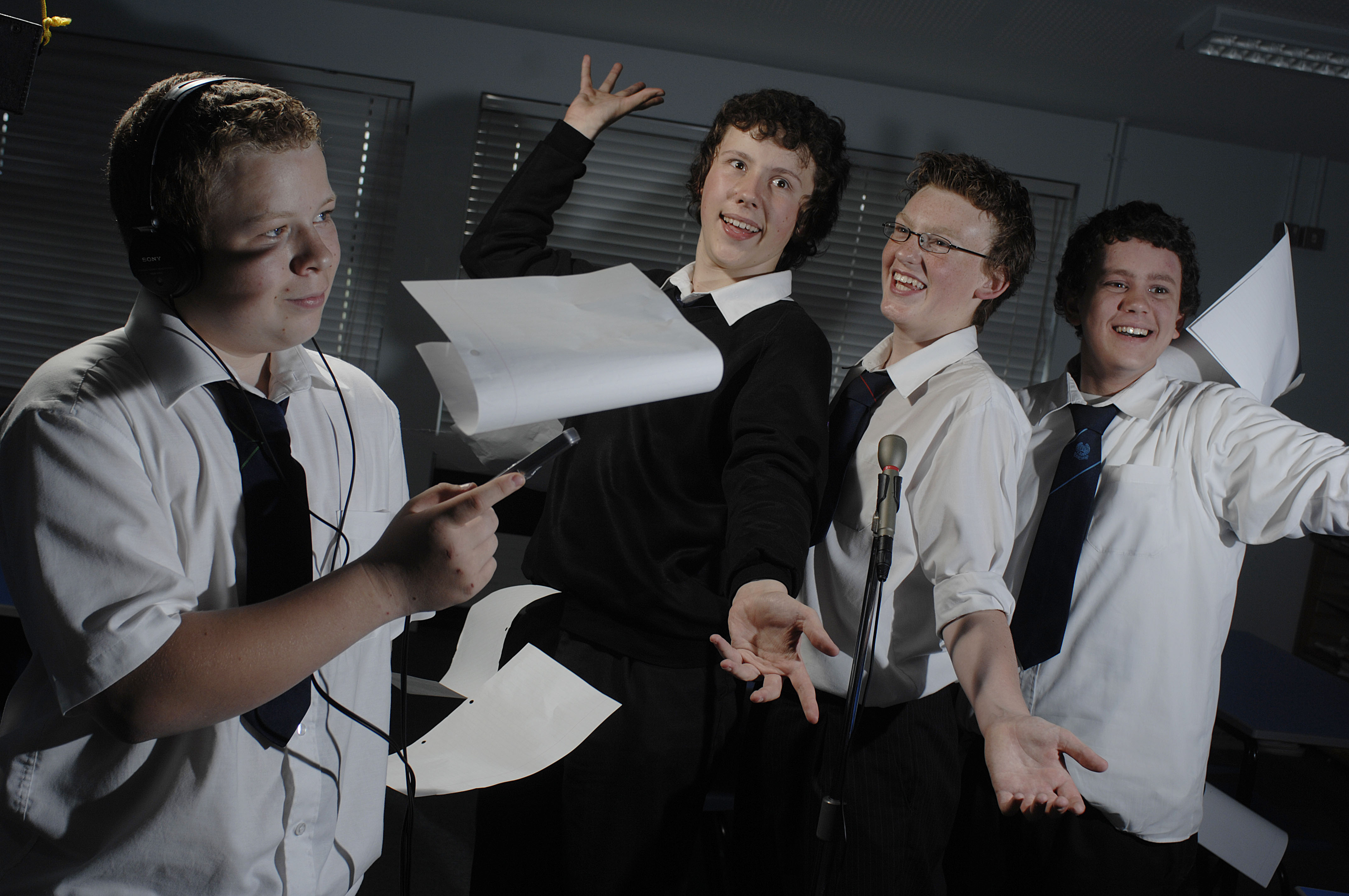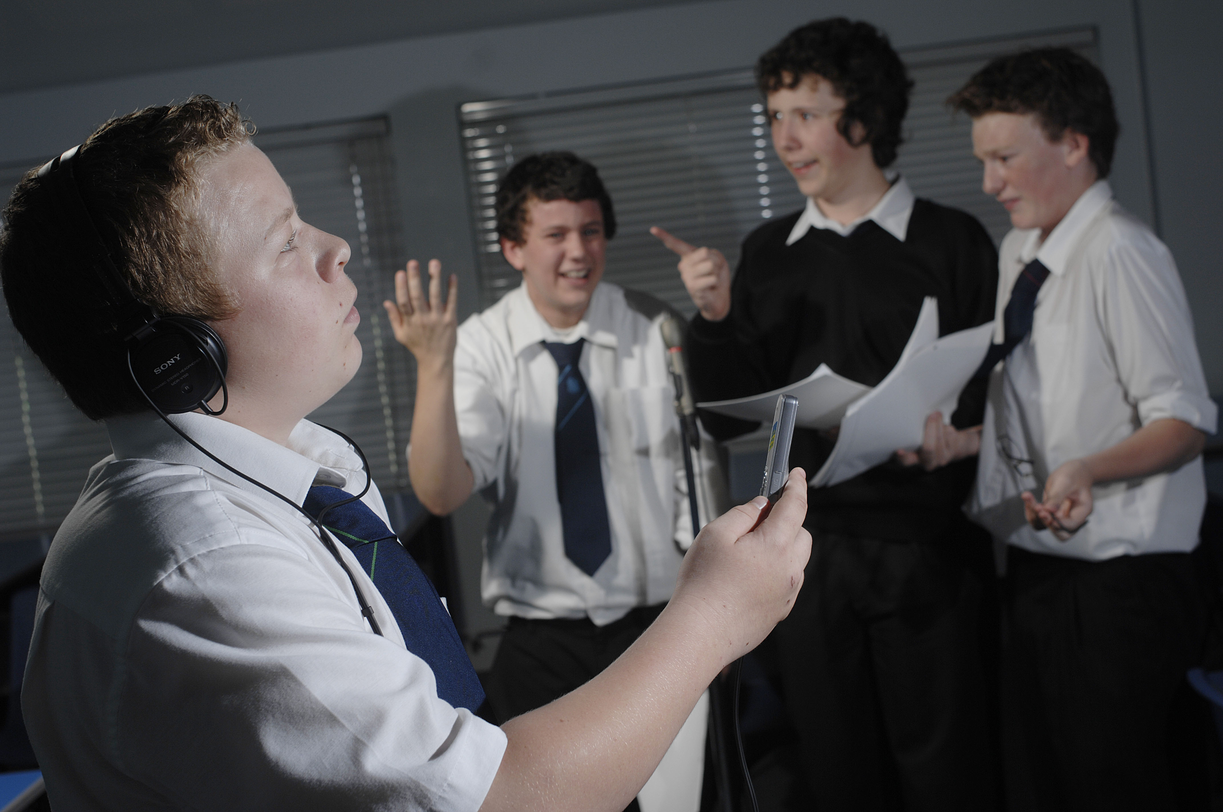 Pic by Si Barber - 07739 472 922 Students from Cliff Park High School, Gorleston, Norfolk recording an episode of 'Fables of The Old Country' a radio soap based on BBC Radio4's the Archers 'but with more explosions'. Head of English Steve Sorrento came up with the idea to enhance pupils literacy skills in a meaningful way. The school purchased a broadcasting licence for ?3500 and the program can be heard at www.radiowaves.co.uk/cliffp.... In the picture are Jamie Stubbs, (headphones) Alex Fox (black top) Ellery Child (tie with crest) and Jonnie Bayfield (glasses). 170507. Ordered by Neil Turner.