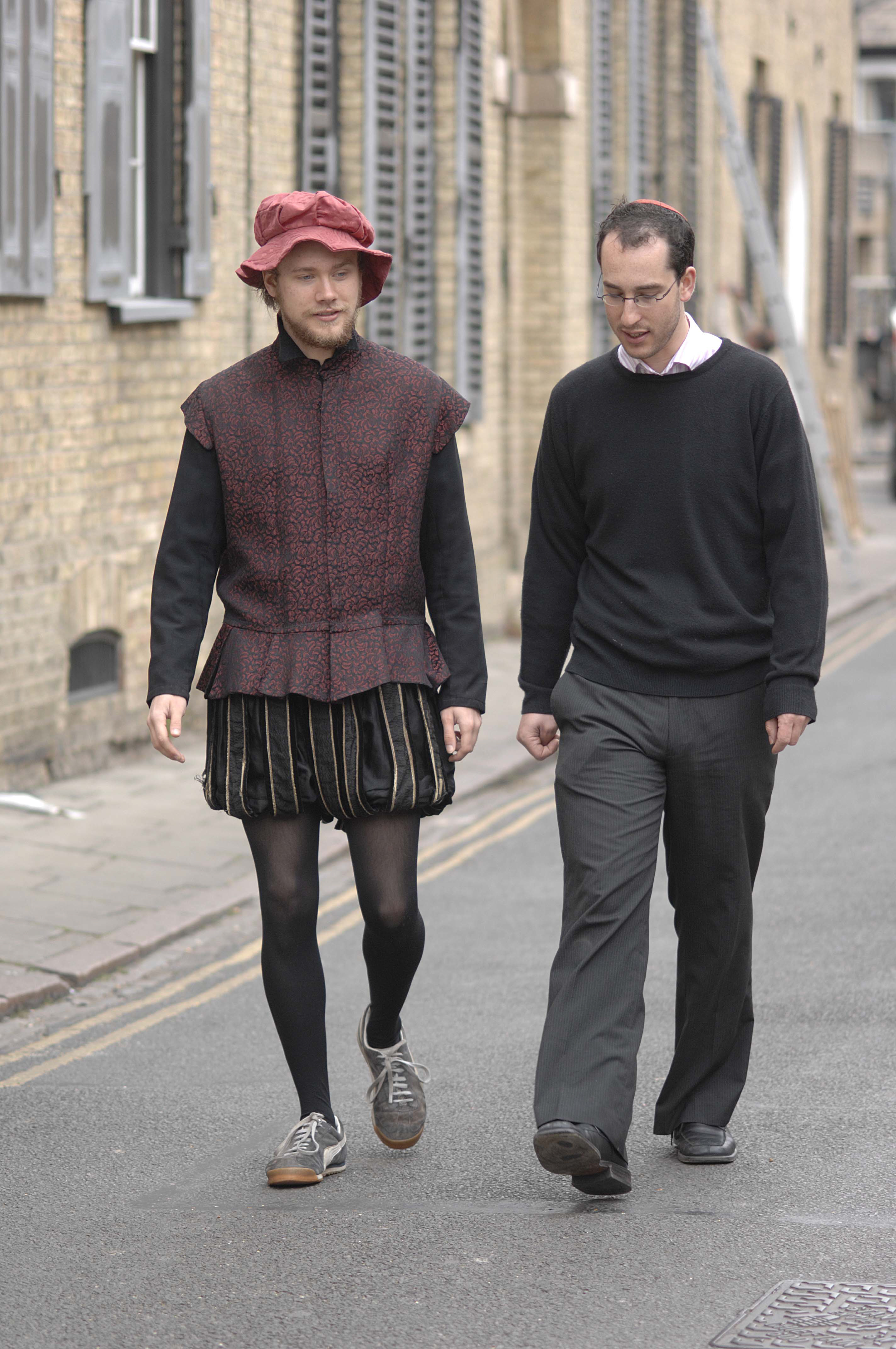 ©Si Barber. Moral rights asserted.   Pic by Si Barber - 07739 472 922 Cambridge student and actor Thomas Yarrow who is due to play Shylock in Shakespeare's Merchant of Venice visiting the Cambridge Synagogue to study Jewish culture with Nathan Jaffay. Pic shows modern and medieval Jewish clothing -nb In Shakespeare's time Jews were required by law to wear a red cap. Ordered by Jo Ruck 040507