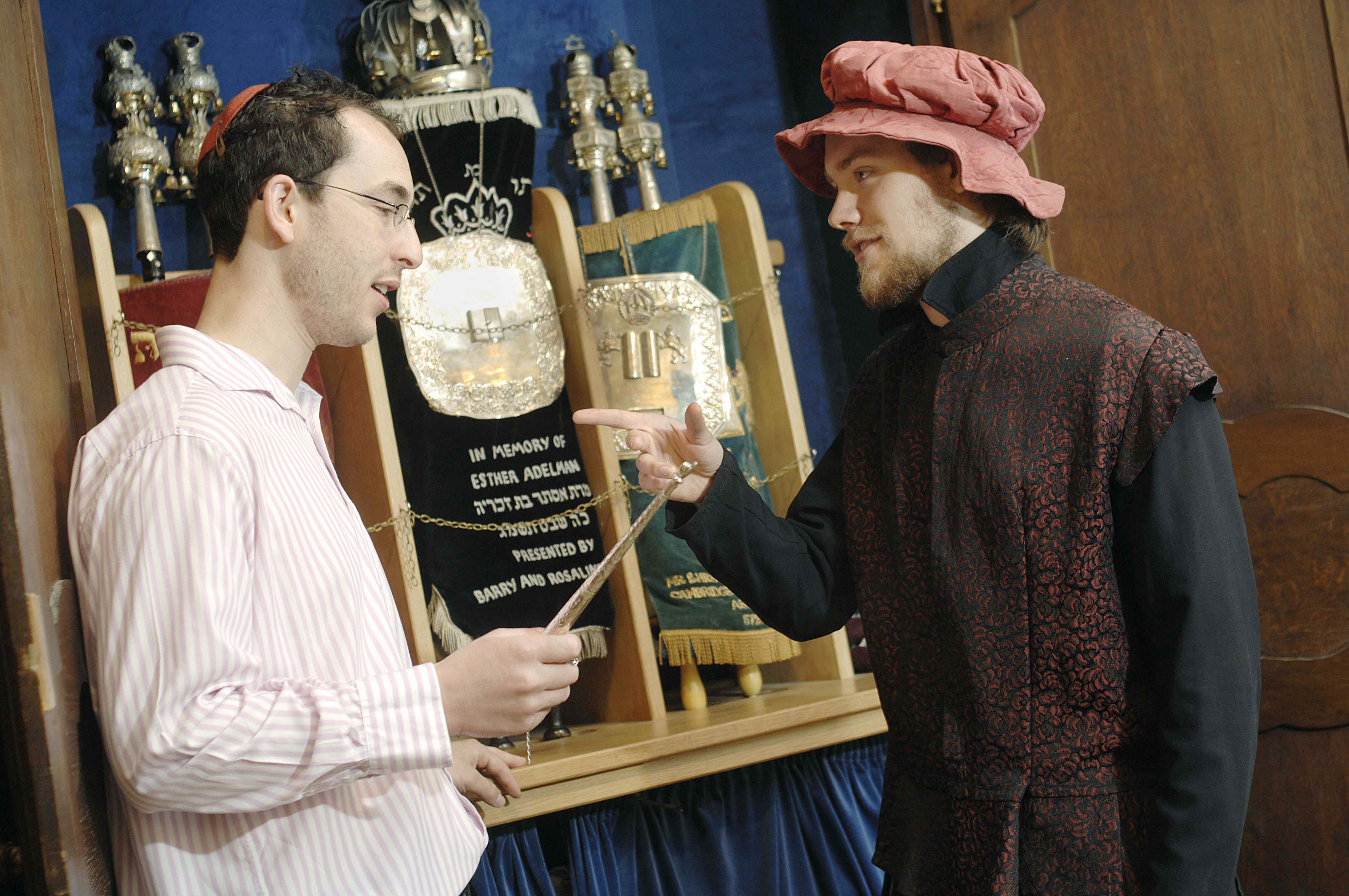 Cambridge student and actor Thomas Yarrow who is due to play Shylock in Shakespeare's Merchant of Venice visiting the Cambridge Synagogue to study Jewish culture with Nathan Jaffay. Pic shows Nathan Jaffay and Thomas Yarrow with the Torah. Ordered by Jo Ruck 040507