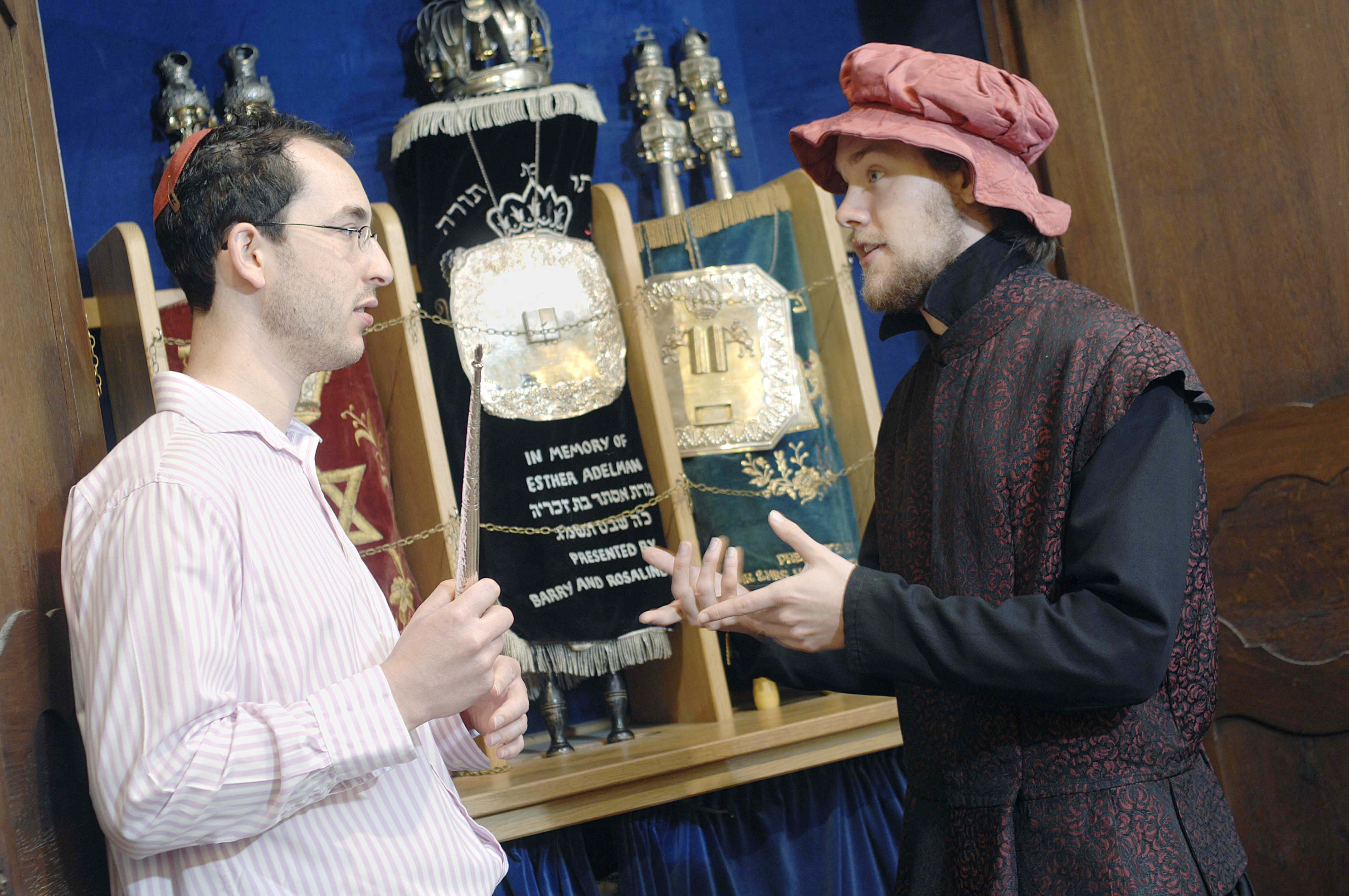 ©Si Barber. Moral rights asserted.   Pic by Si Barber - 07739 472 922 Cambridge student and actor Thomas Yarrow who is due to play Shylock in Shakespeare's Merchant of Venice visiting the Cambridge Synagogue to study Jewish culture with Nathan Jaffay. Pic shows Nathan Jaffay and Thomas Yarrow with the Torah. Ordered by Jo Ruck 040507