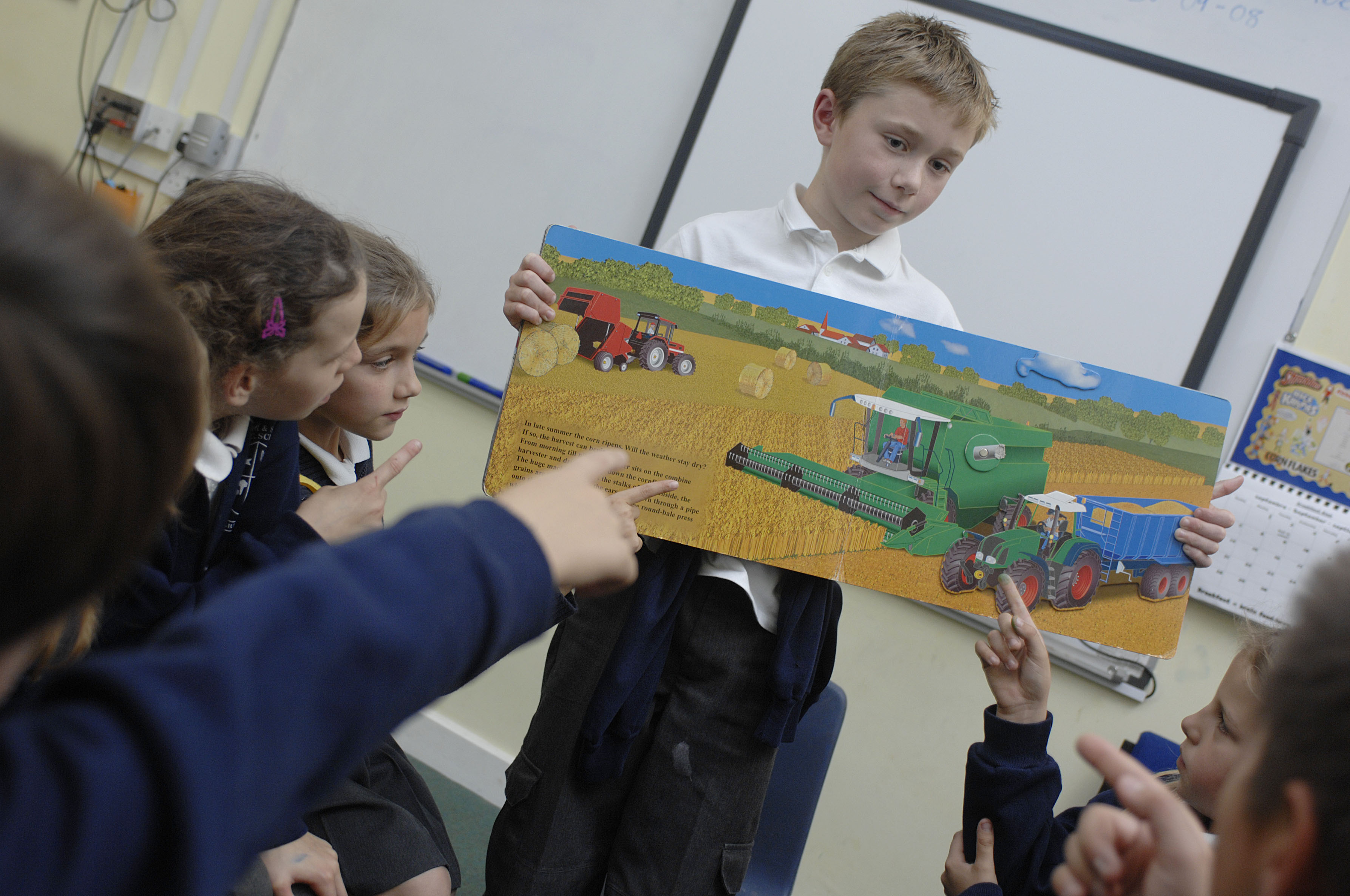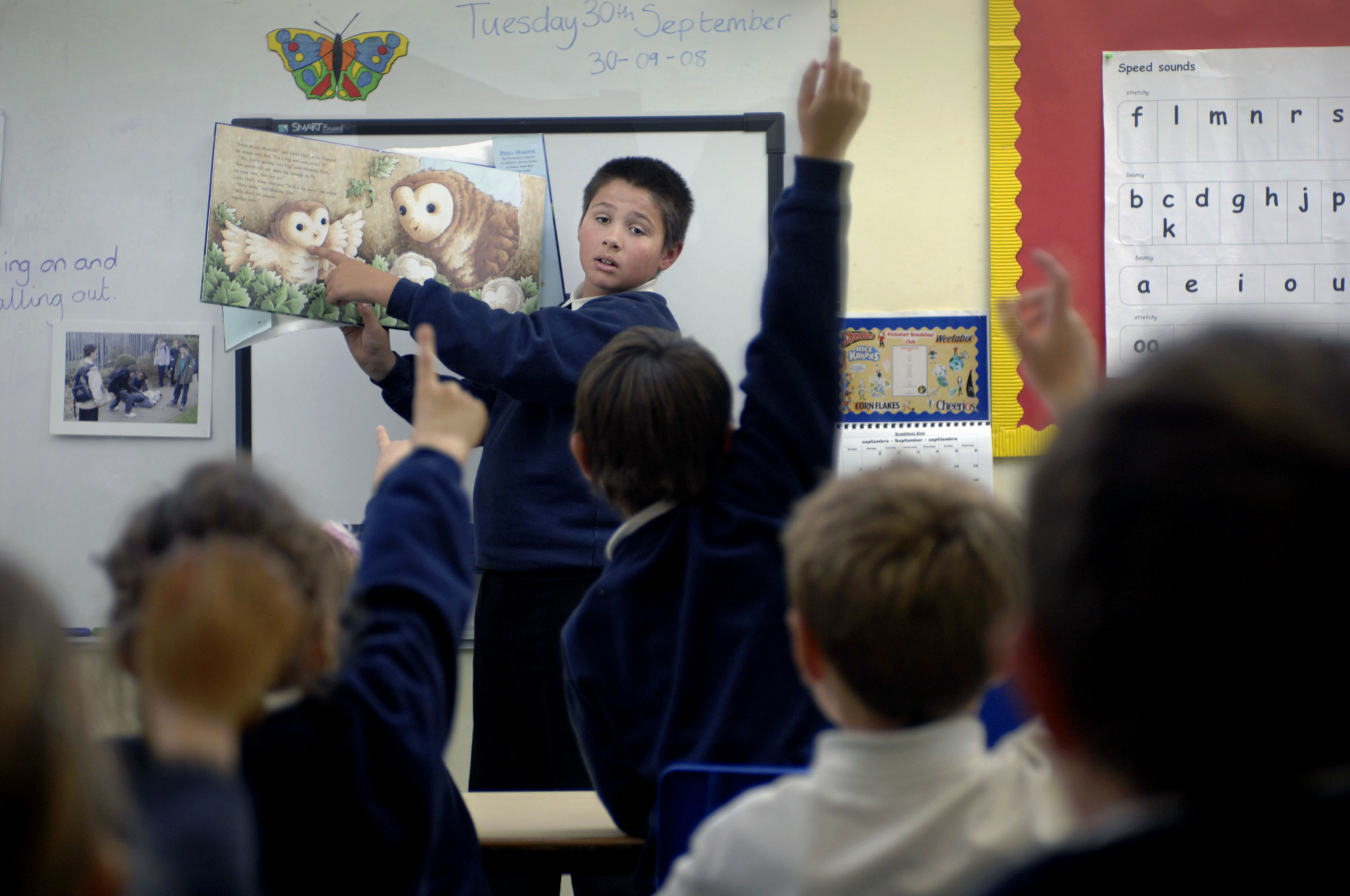 PHOTOGRAPHER - Si Barber 07739 472 922 COMMISSIONED 300908 -CHARLOTTE MAGUIRE Children of St Peter and St Paul primary school, Carbrooke,Norfolk interviewing and testing their classmates as they take over the school for a day and appoint their own teachers. Pic shows Tom showing job candidates teaching methods.