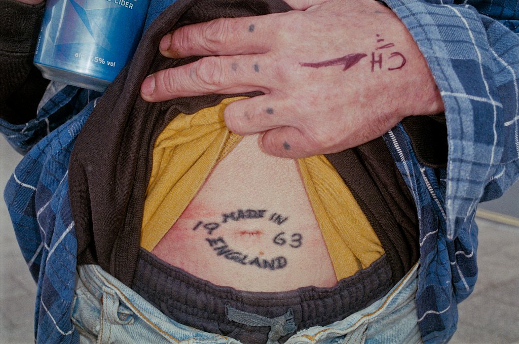 A man with a tattoo on his belly stating ‘made in England 1963’