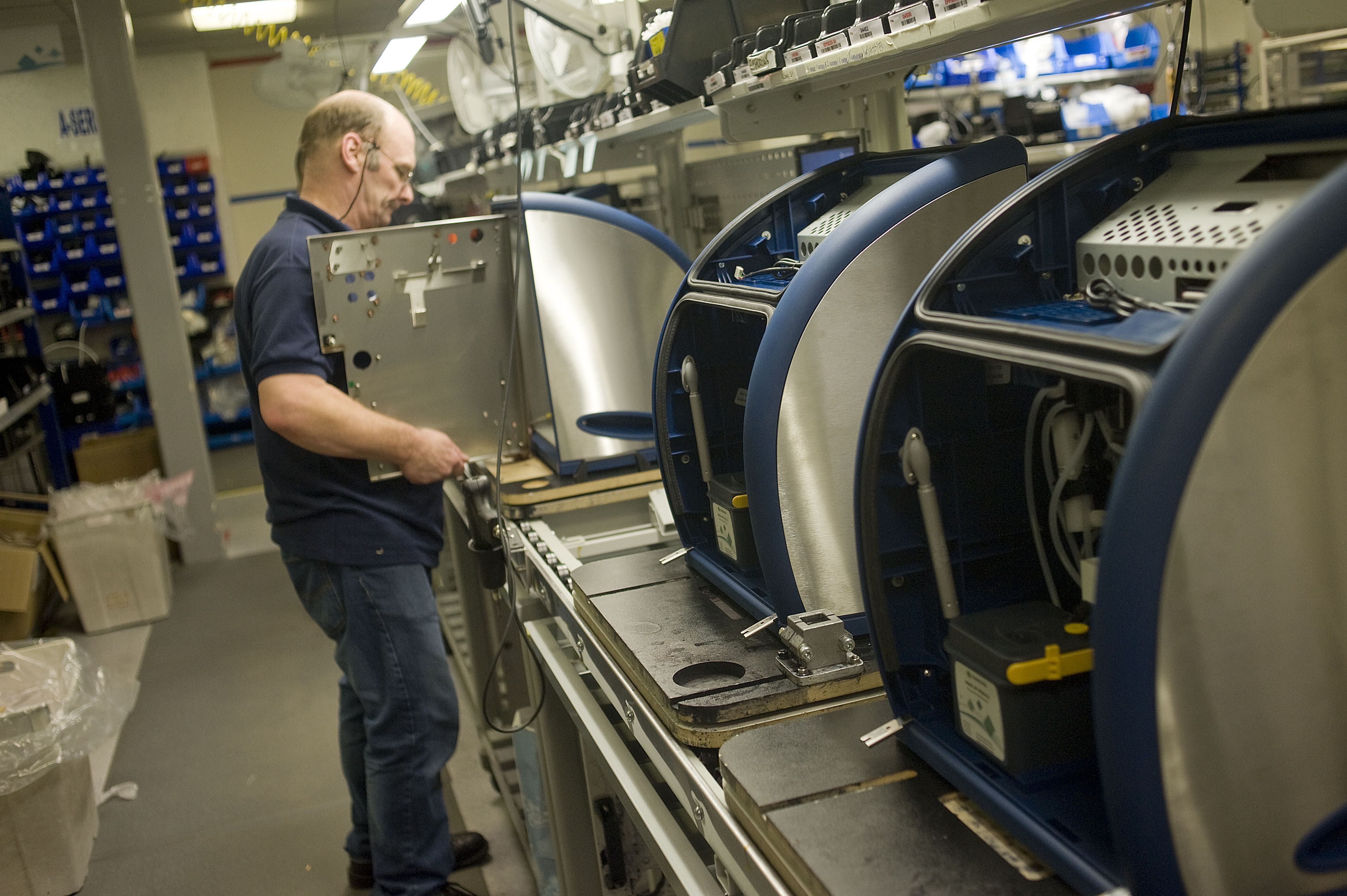Domino Printing factory floor. Images shows: Components being fitted into the printer chassis.