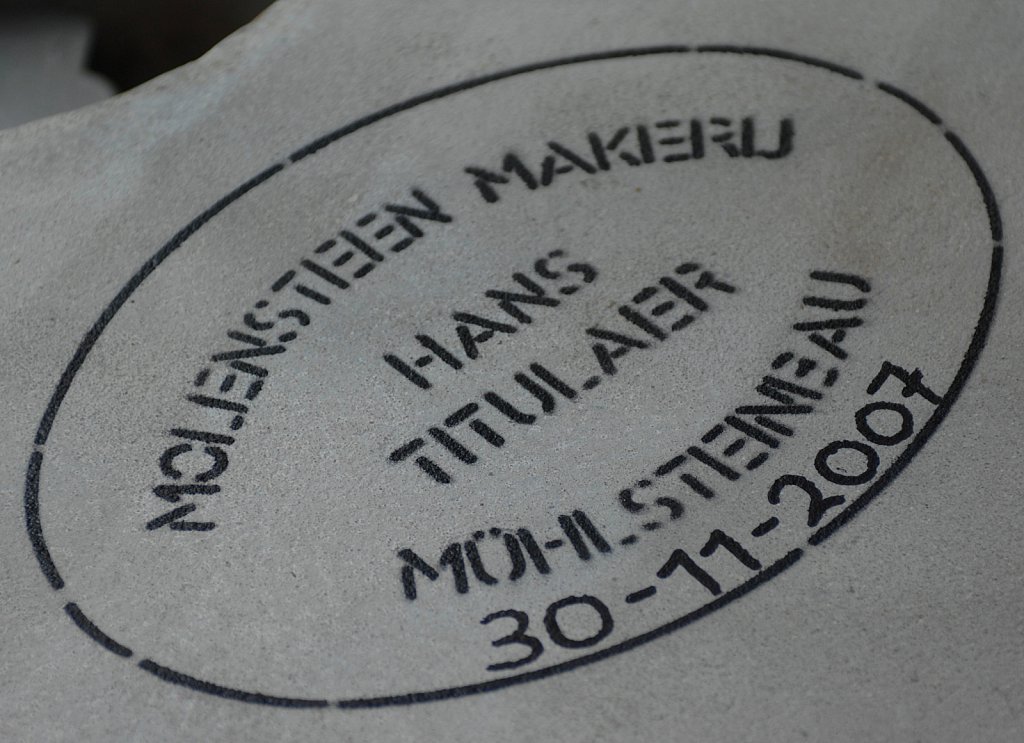 Letheringsett Watermill, in Norfolk which has been milling grain commercially since Medieval times. The mill has just installed two new grinding stones from Holland allowing them to double production. Pic shows maker's mark on stone