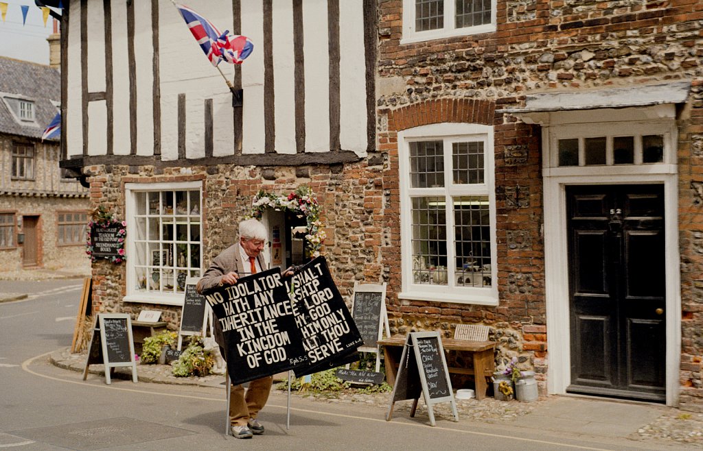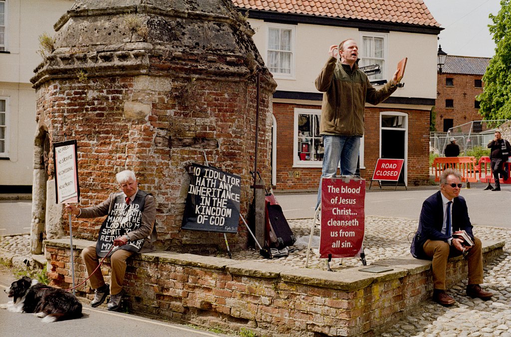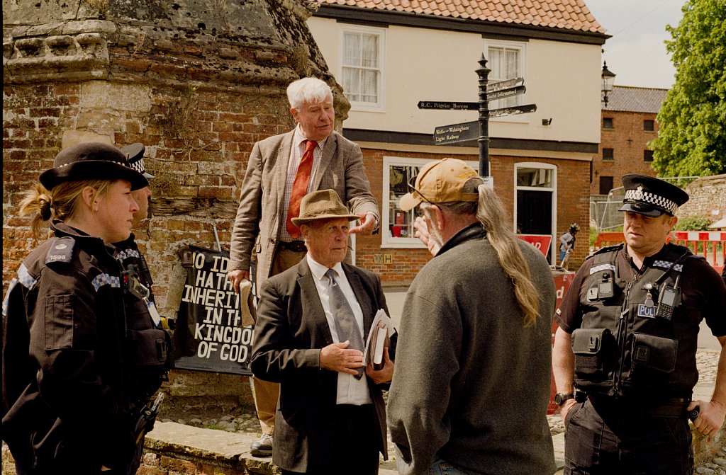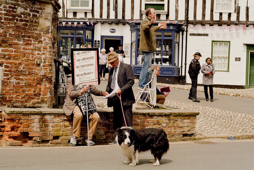Evangelical protestors picketing the the annual Whitsun pilgrimage to Walsingham, Norfolk. The protestors object to the Anglican church's refusal to adhere to the 39 Articles Of Faith. The Articles are a set of statements defining the doctrines and practices of the Church of England, established in 1563 and finalized in 1571. They reflect the Anglican Church’s theological position during the English Reformation, balancing Protestant and Catholic influences. Amongst others, they forbid the worship of idols, and doctrines like purgatory, indulgences, and veneration of relics.
