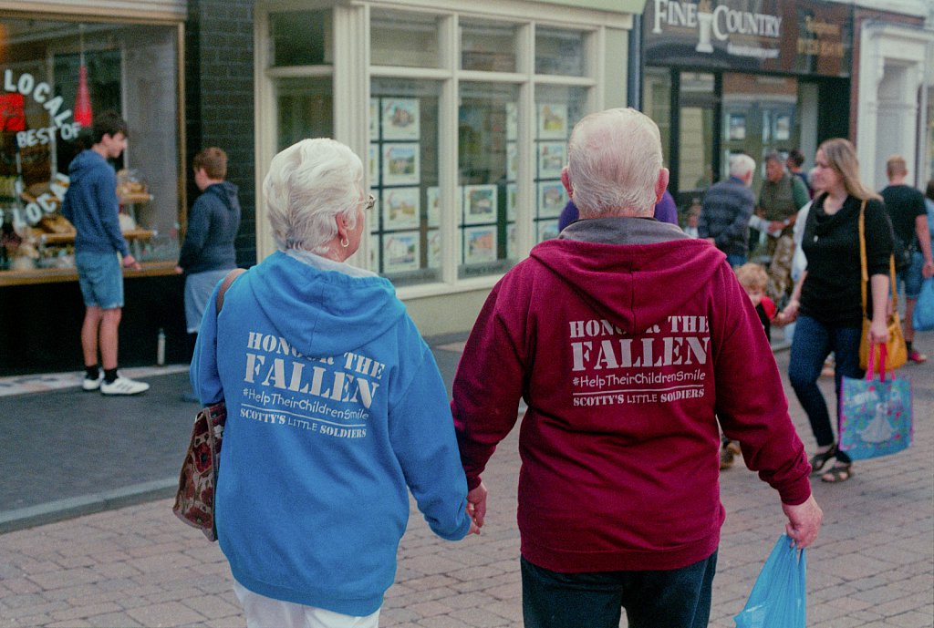 A couple wear clothing supporting the Scotty's Little Soldiers charity which supports children whose parents have died while serving in the armed forces.
