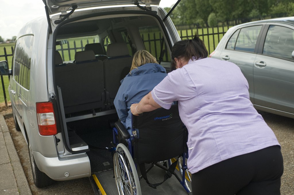 Mandatory Credit: ? Si Barber/07739 472 922 Care assistant helping a wheelchair user into a car