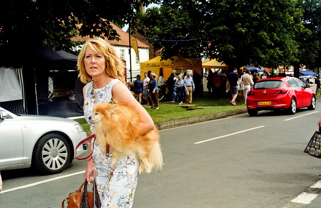 A woman carrying a dog in Burnham Market, Norfolk,UK.