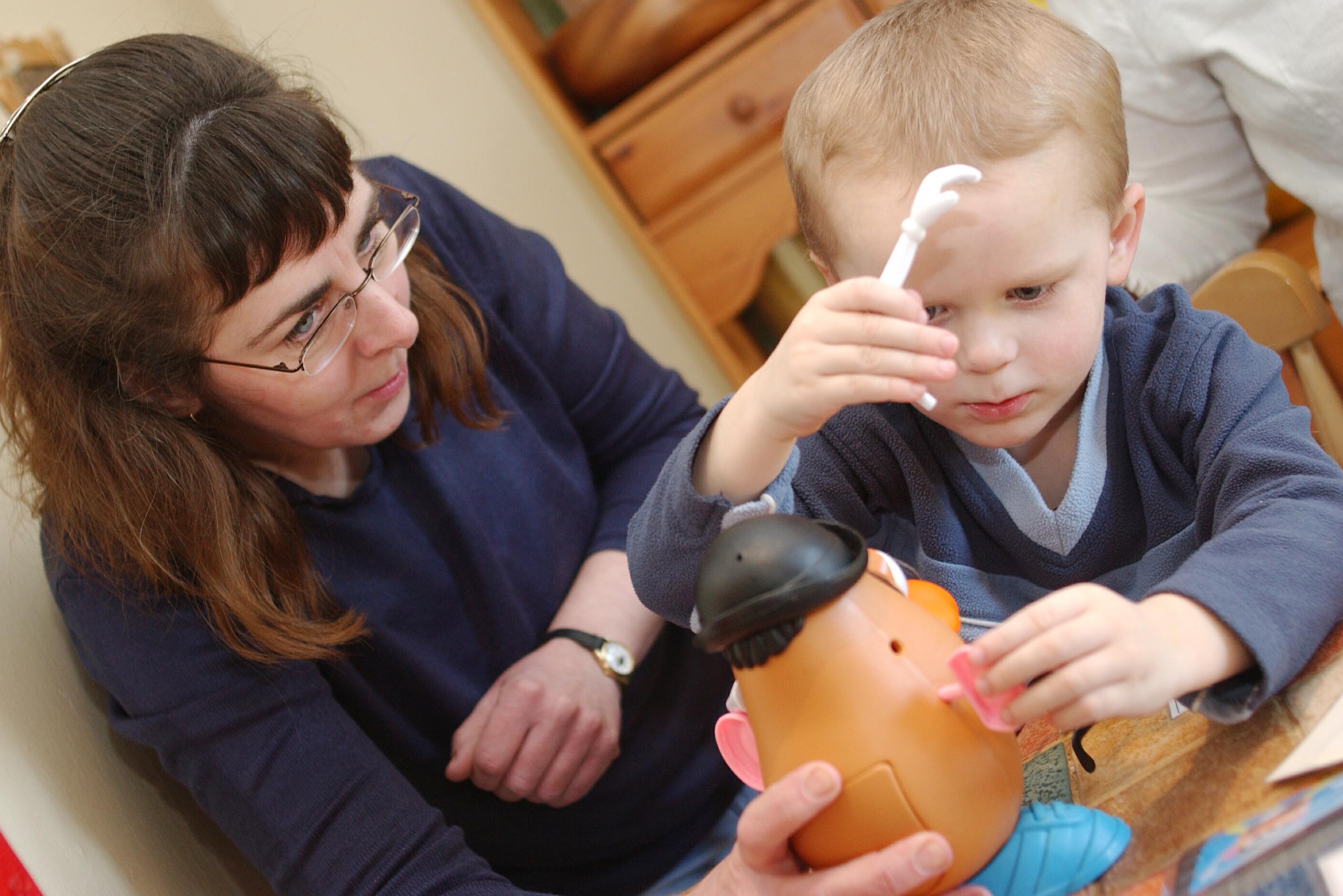 Pic by SI Barber - 07739 472 922 3 year old George Hislop with portage tutor Helen Ayers at home in Walsham Le willows, Suffolk. Ordered by Joanna Ruck