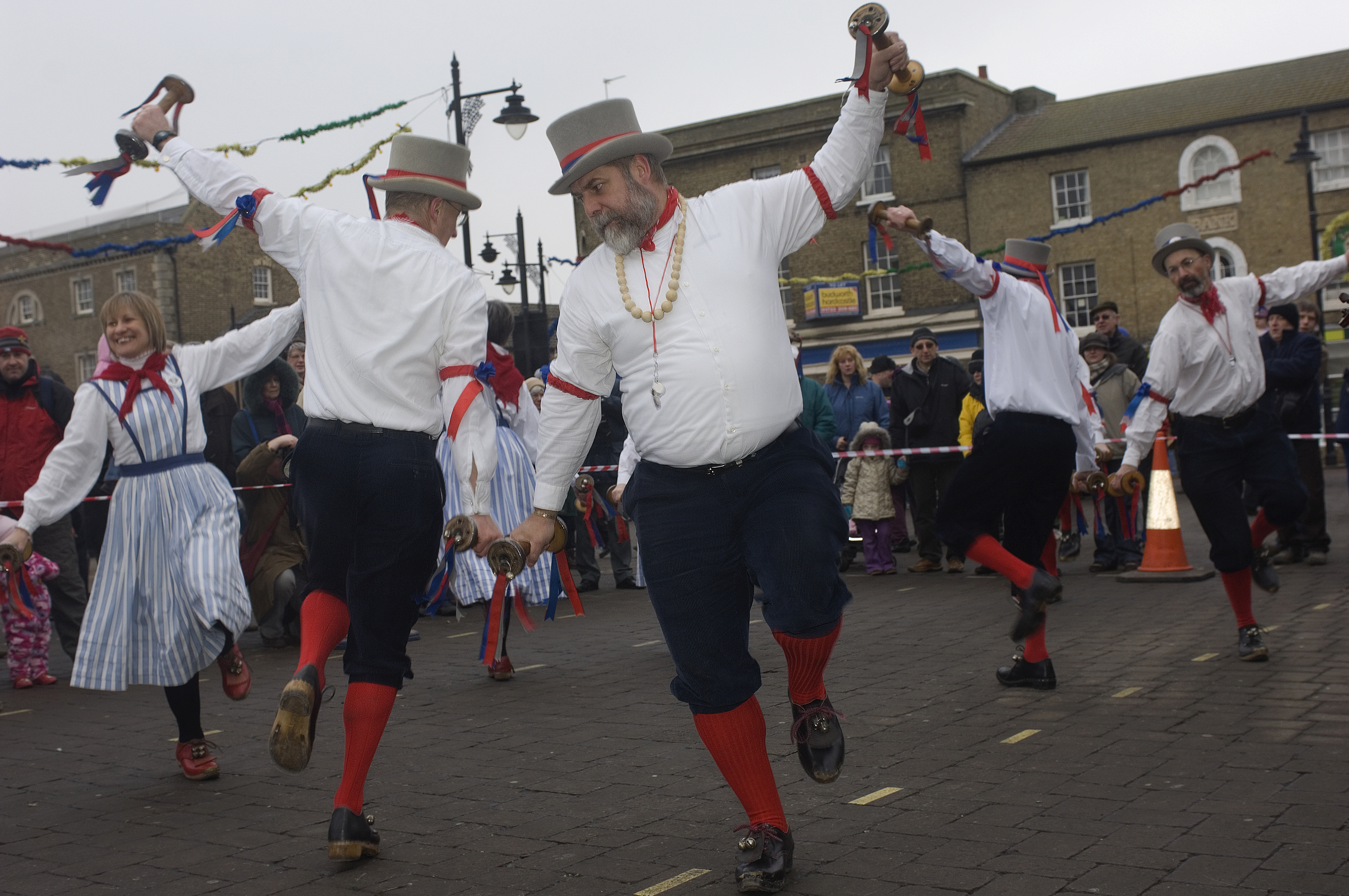 PHOTOGRAPHER - Si Barber NOT COMMISSIONED REPro FEE PAYABLE Morris dancers at the Straw Bear festival, Whittlesea, Cambs. The festival is a revival of a centuries old tradition when it is thought unemployed agricultural labourers dressed up in rags and came into the villages to entertain the population for money. Forbidden by law in the early 20th Century, the highlight of the event is when the straw 'bear' who is paraded through the town by his keeper and then set on fire in a nearby field. The modern event attracts Morris and Molly dancer from across the county.